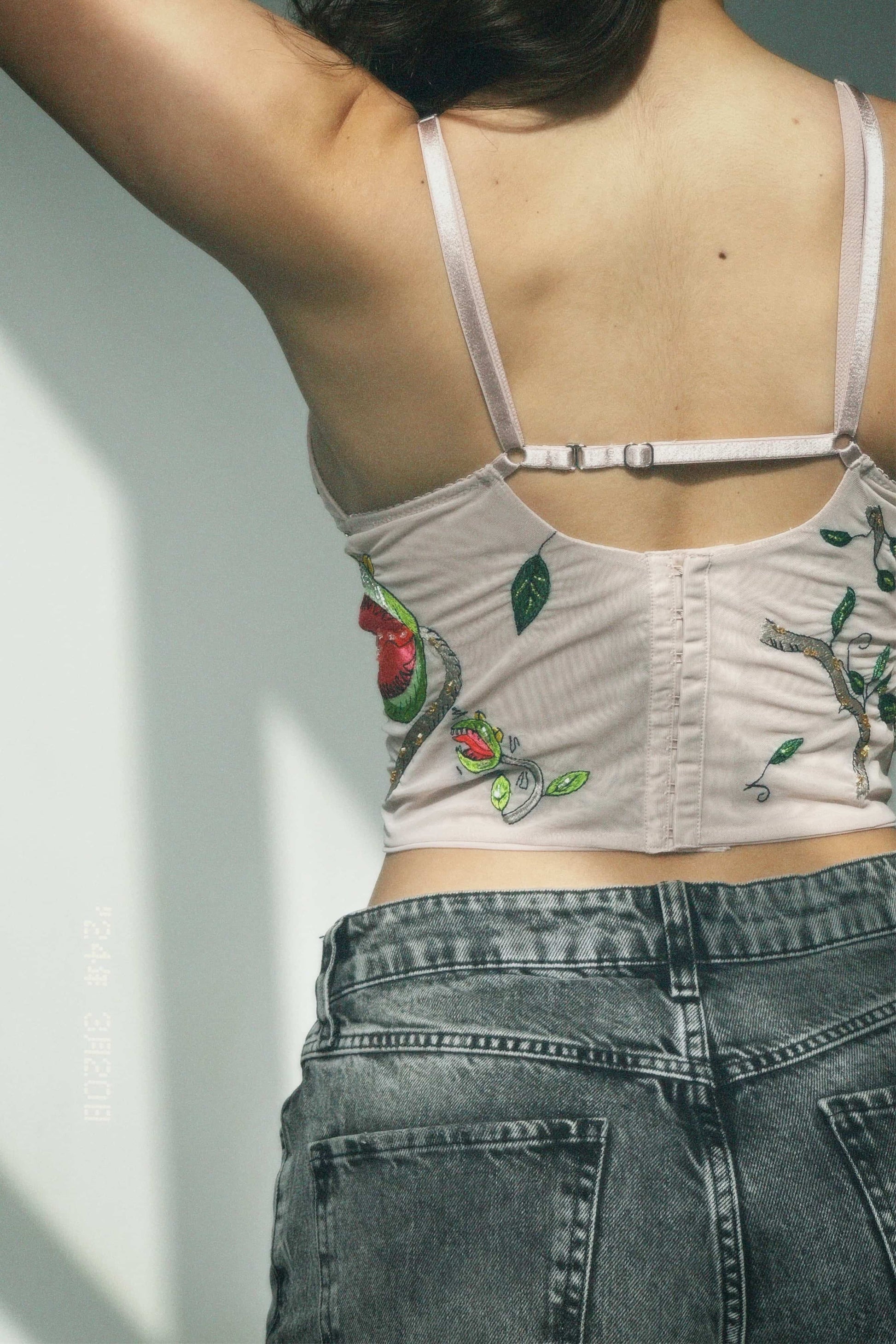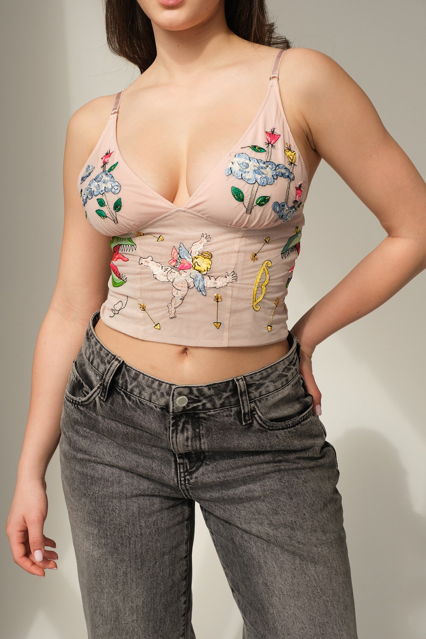 Cupid is crafted from soft lingerie mesh. The garment is handmade using machine embroidery, with all details and beads hand-sewn.