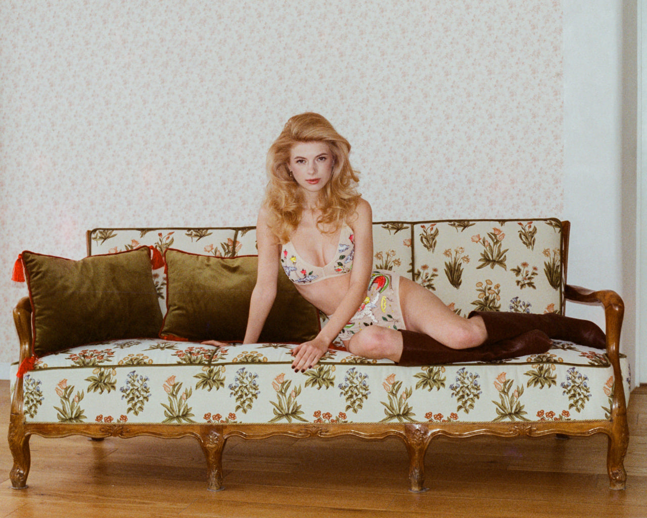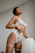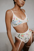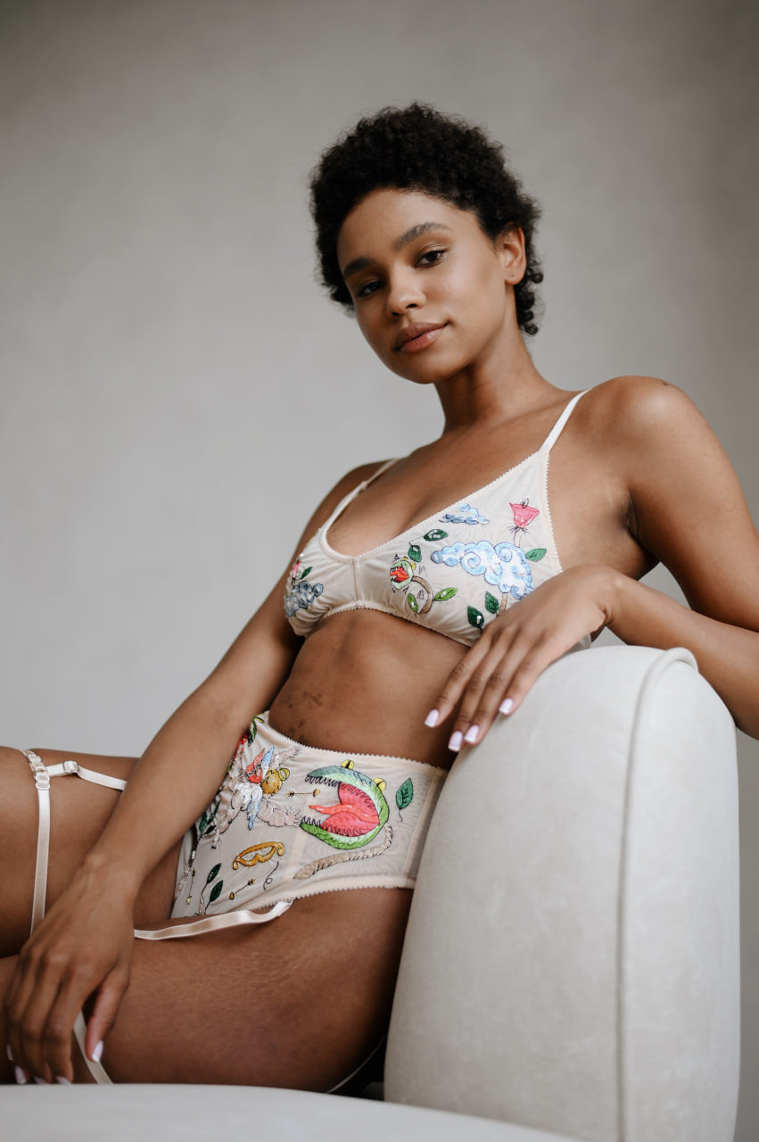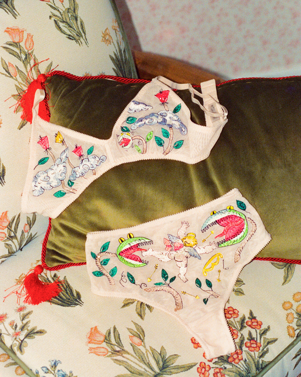 This is a handmade lingerie set featuring machine embroidery (all details and beads are sewn by hand).