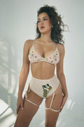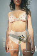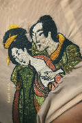 This stretch mesh high waisted knicker is beautifully embroidered with a Japanese couple, reminiscent of classic ukiyo-e paintings prints. The beige fabric is accented with droplets of multi-colored beads, making this lingerie piece truly eye-catching.