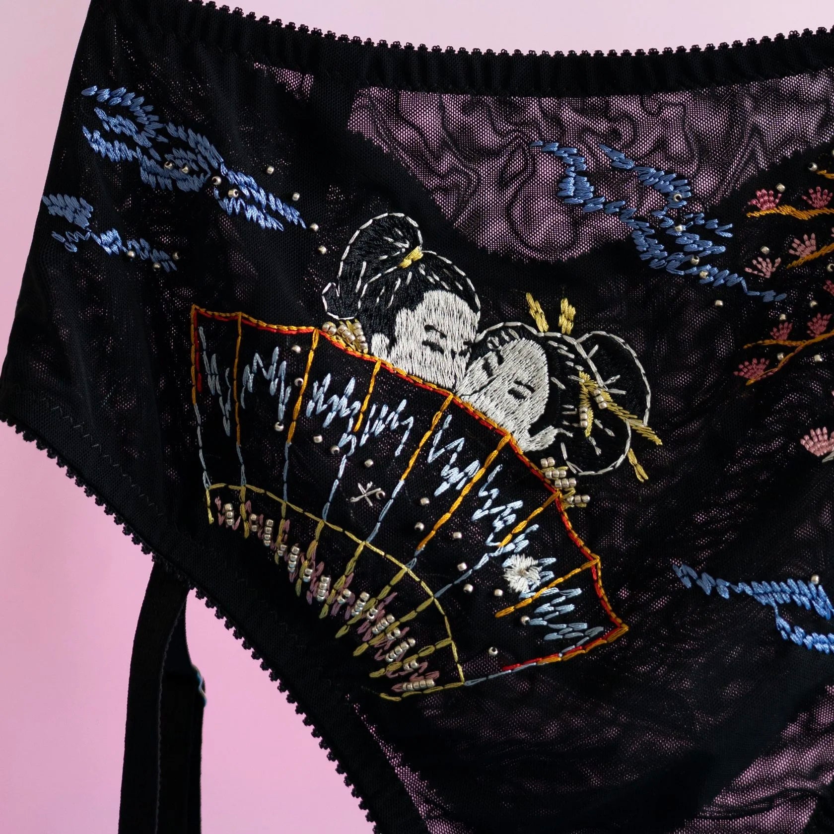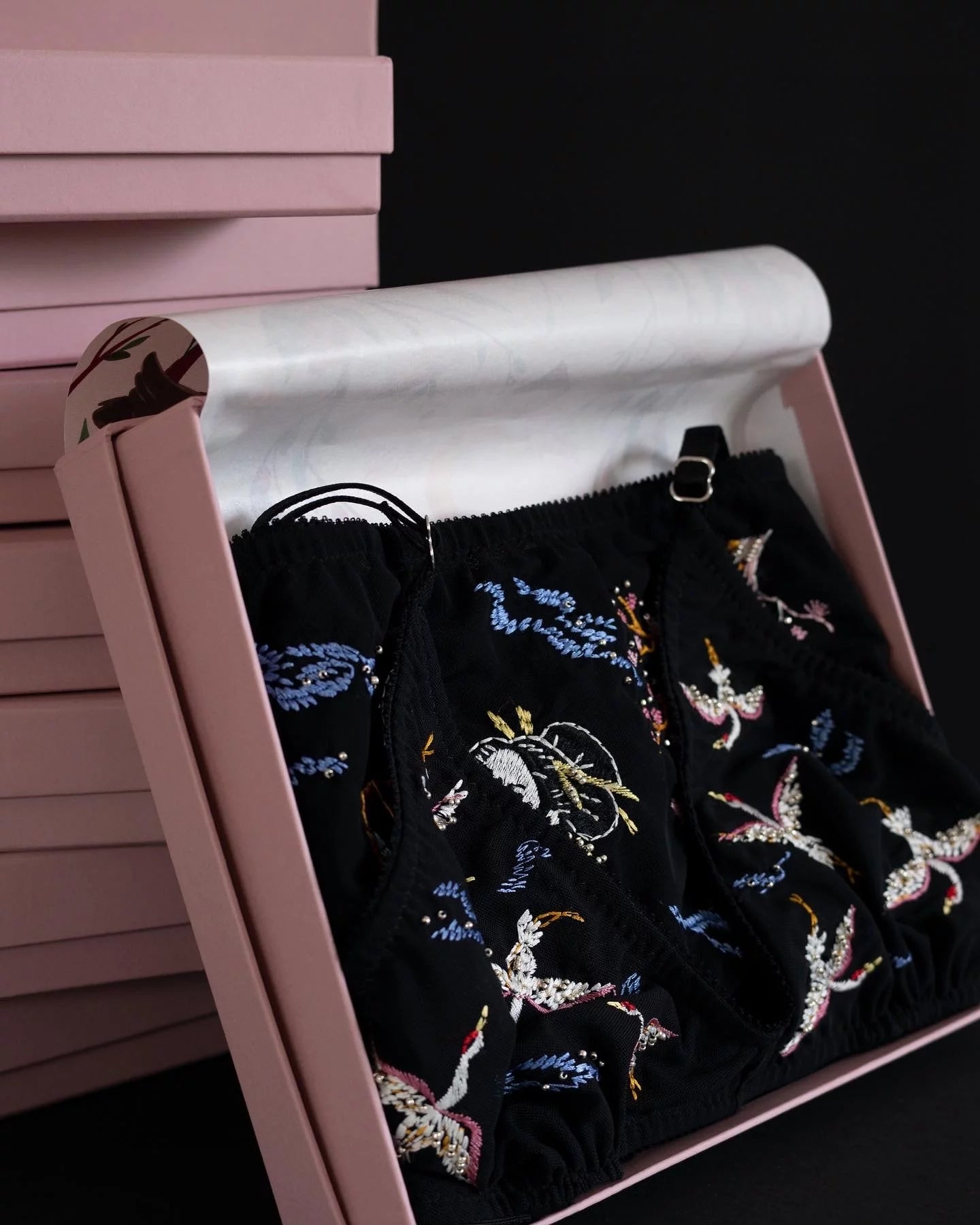 Deep black color, elastic and soft lingerie mesh, 8 soaring cranes on the bodice.