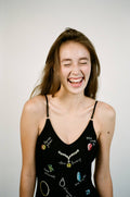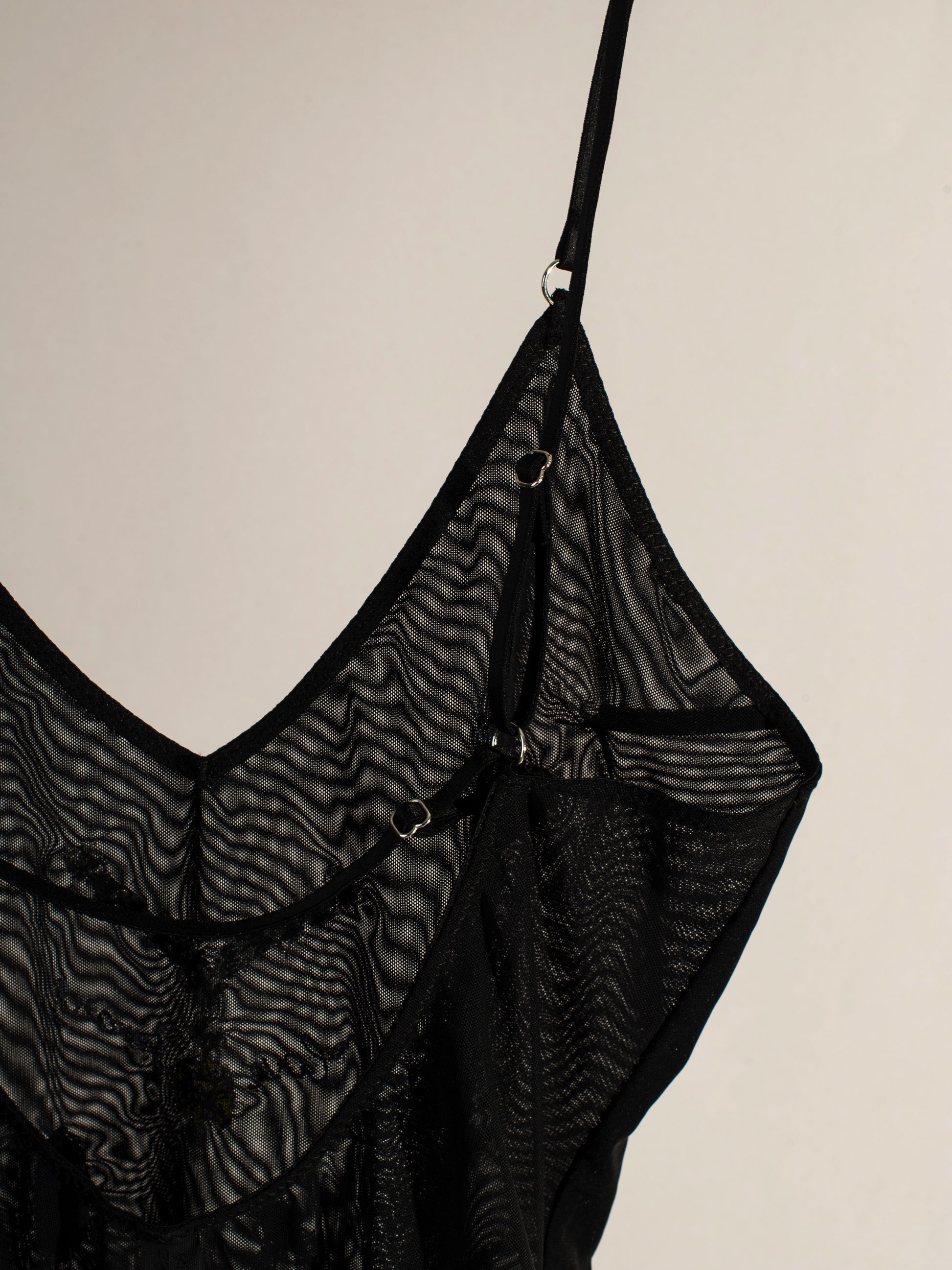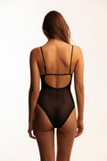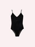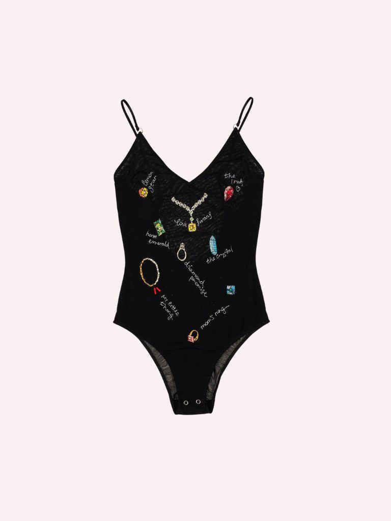 A girl's best friend…Love & Swans bodysuit in black! The luxurious black velour serves as the perfect backdrop for the sparkling diamond embroideries, making it look like real jewelry.