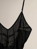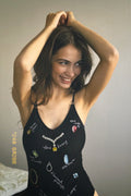 The handwritten notes from top to bottom add an extra touch of elegance to this already stunning cut stretch bodysuit. Experience the luxury with this must-have piece in your wardrobe!