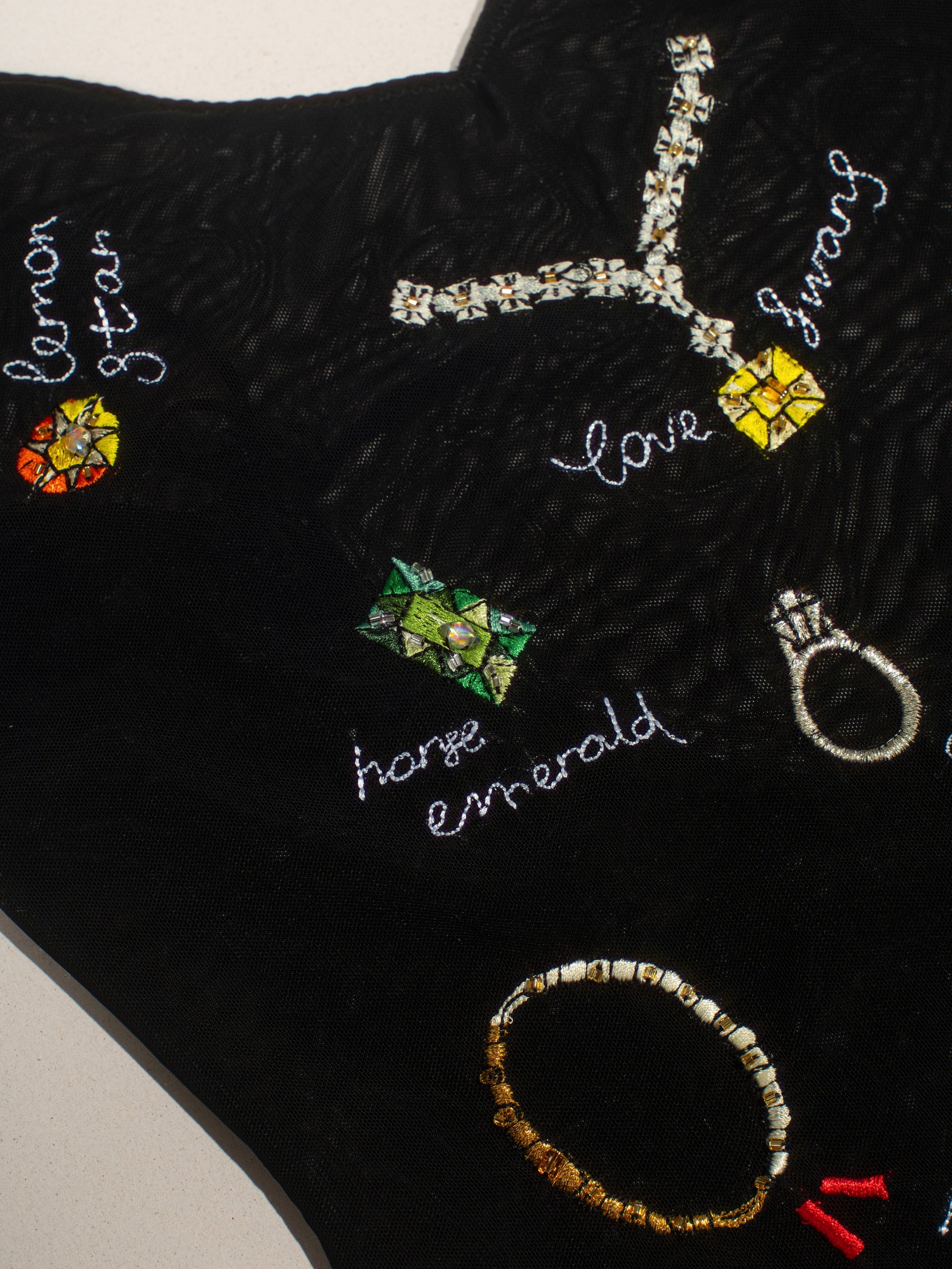 This is a handmade lingerie piece featuring machine embroidery (all details and beads are sewn by hand).