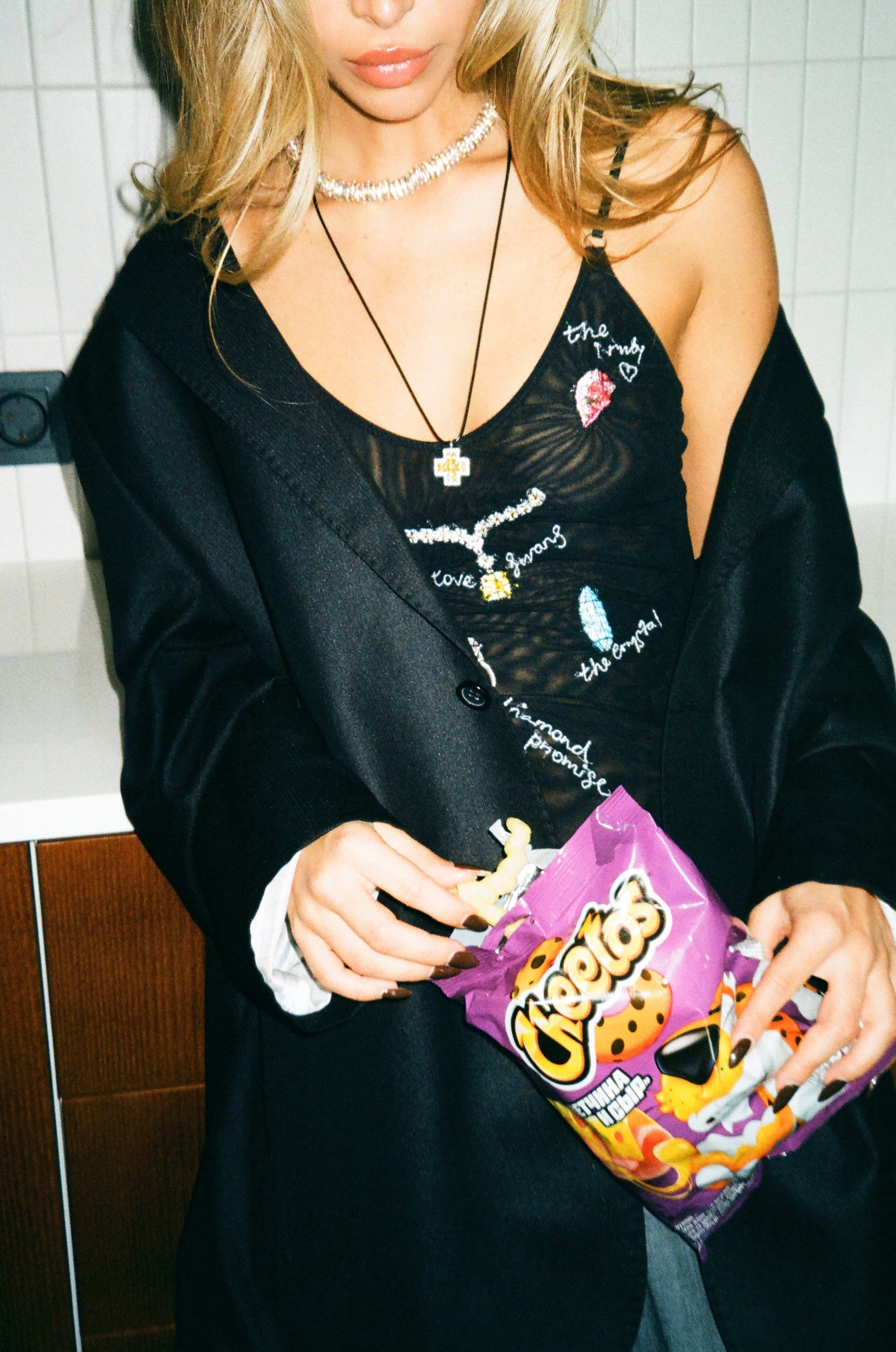 This garment is crafted from soft mesh of EU origin, featuring natural pearls and Japanese beads. The fabrics and accessories used meet the stringent requirements of the OEKO-TEX certification, ensuring the highest level of quality and safety.