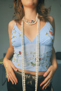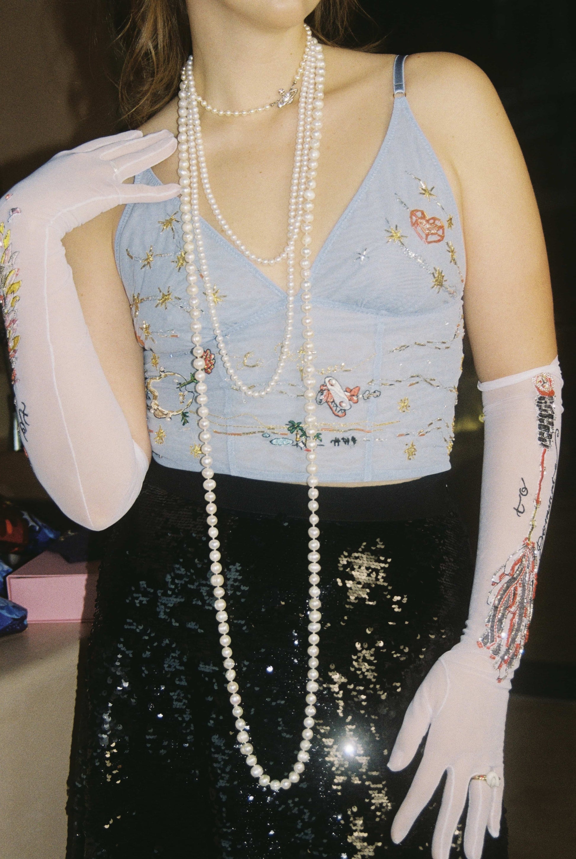 This piece is made of soft mesh of EU-origin, natural pearls, Japanese beads. Fabrics and accessories meet the strictest OEKO-TEX certification requirements.