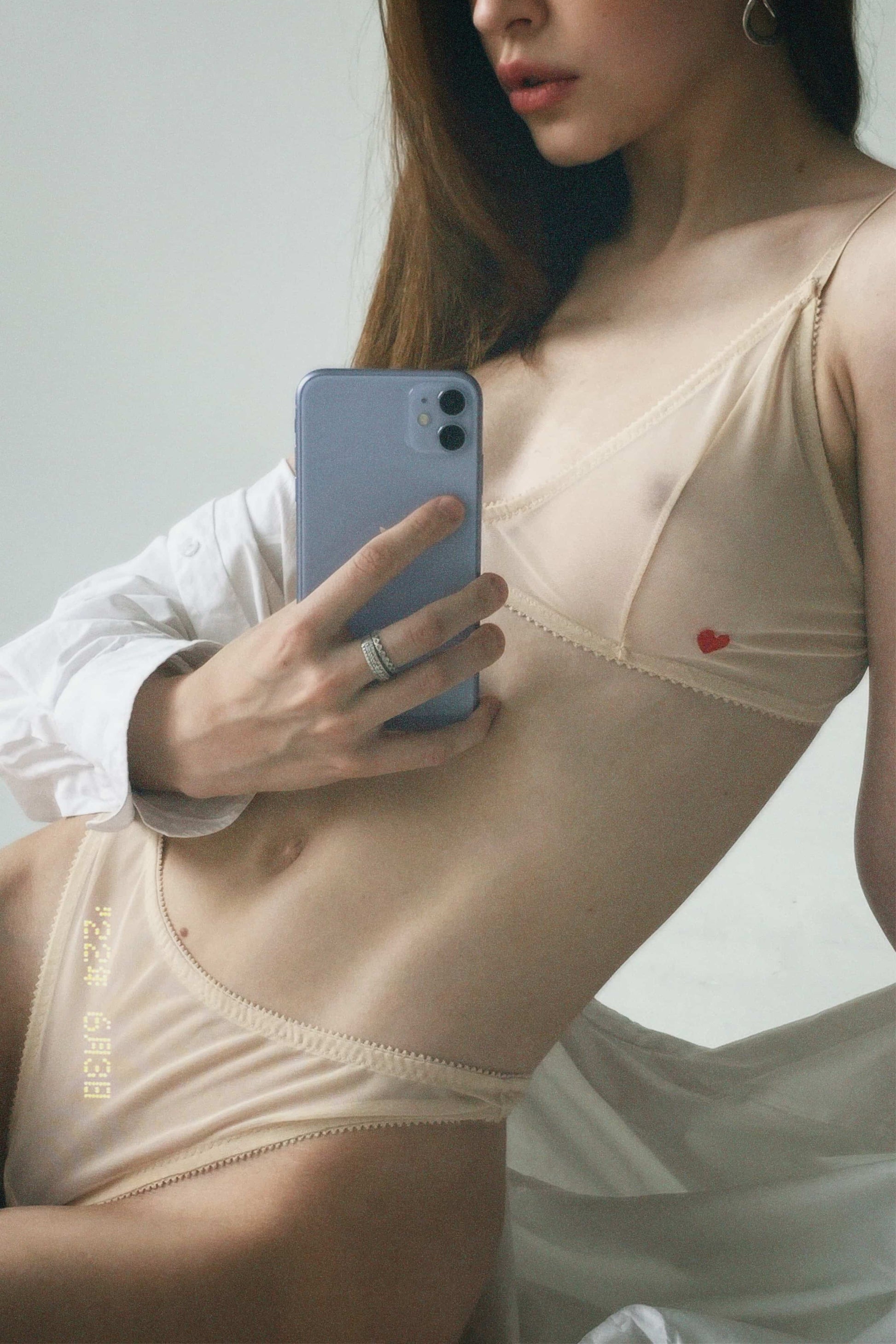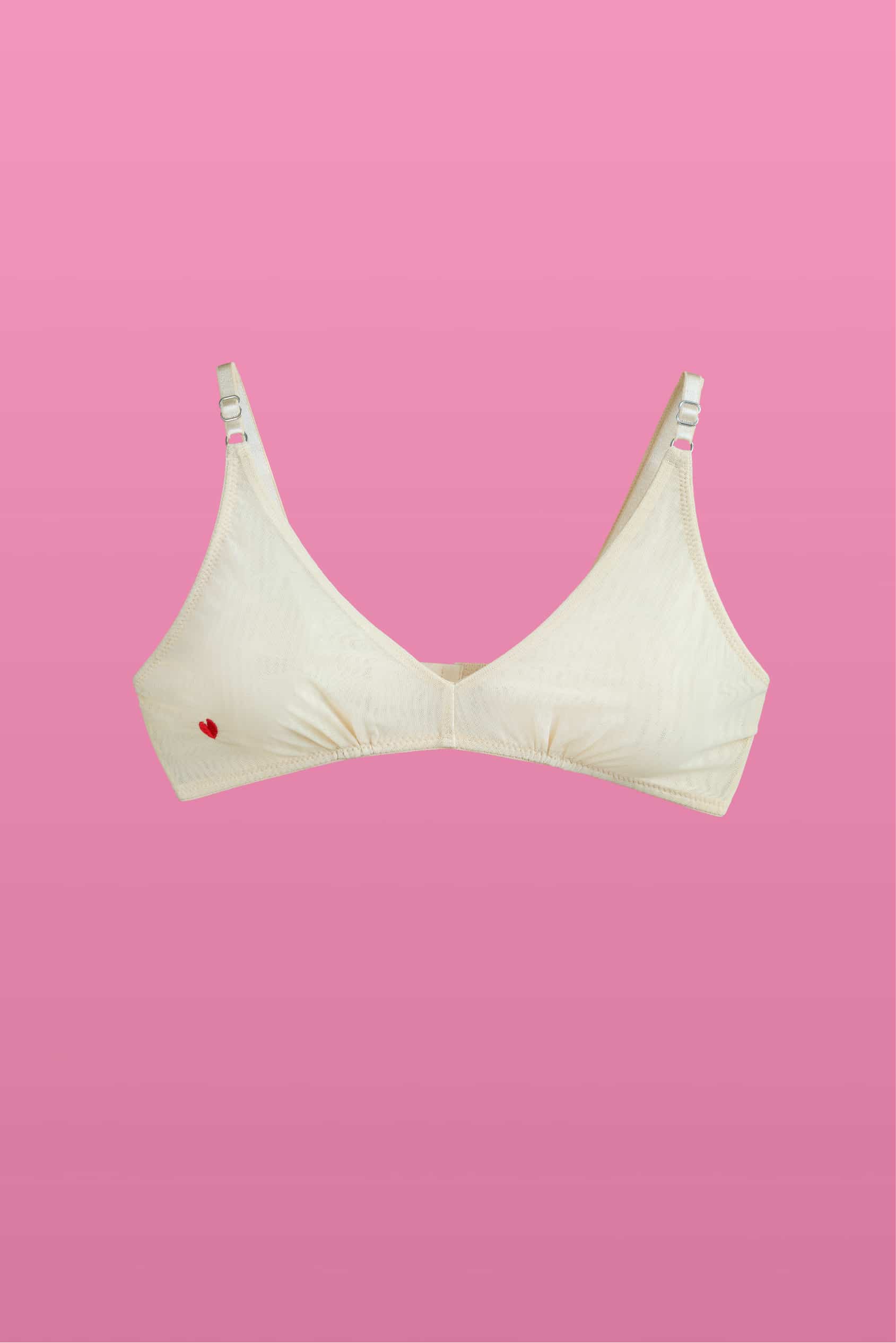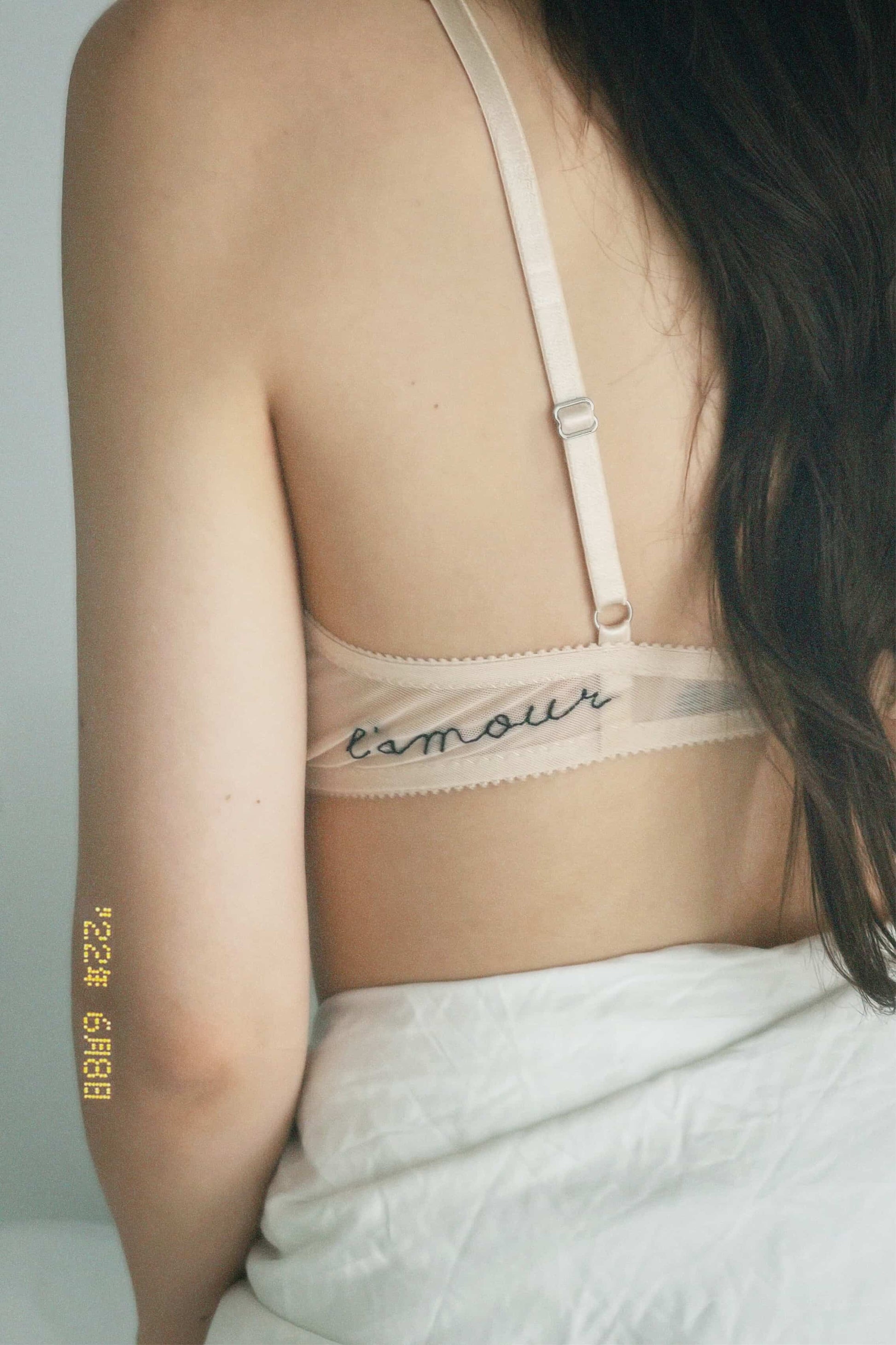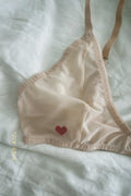 This cute bralette made from super-soft stretch tulle and decorated with a small heart embroidery at the front and L' amoure embroidery at the behind. And, the cups are moulded for a natural shape. You'll forget you're wearing a bra.