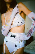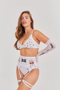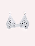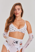The Maid costume starts with a bralette gleaming with splashes of silver glass and metallic thread. Seduce with style and ignite the imagination.