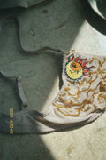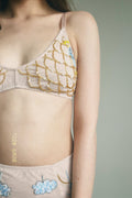 Bra with golden sunset clouds in a wild pagan style, embroidered with natural pearls. The Sun and the Thunderstorm Gods on the cups gaze intently from the clouds at the ballet dance (on panties from this look). The decorative motif on the bra is inspired by the costumes of the dancers of the first Russian Seasons of Diaghilev.