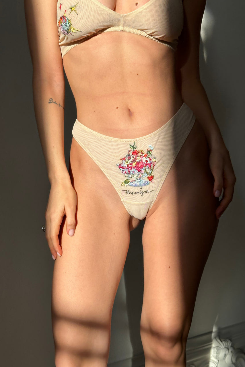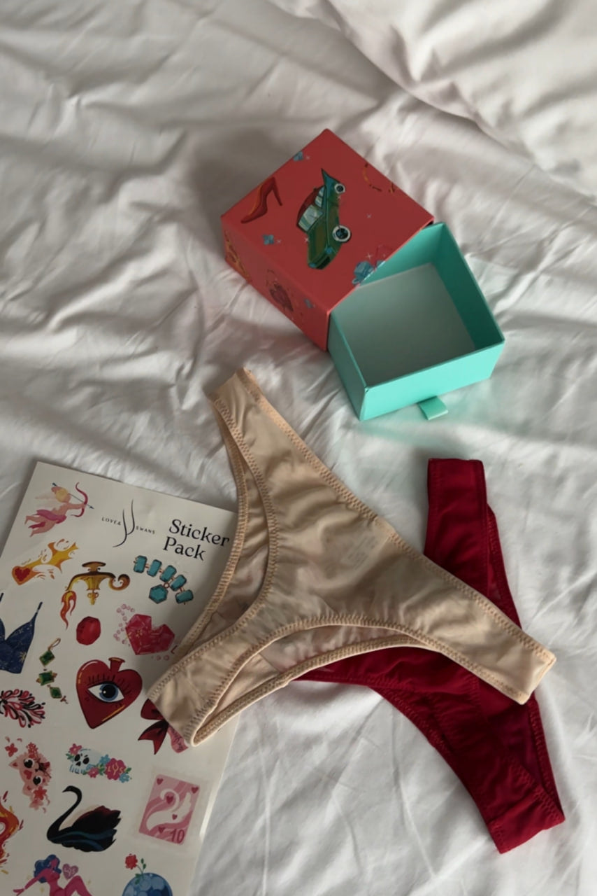 Inside there are two panties that embody hedonism and pleasure in all its manifestations.